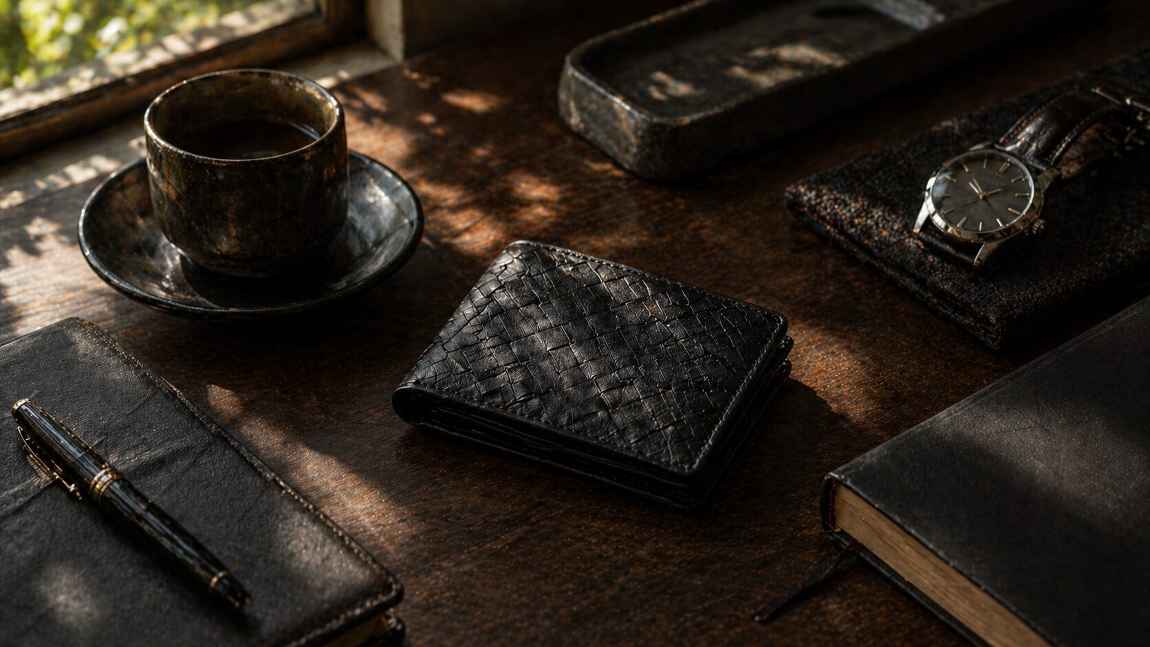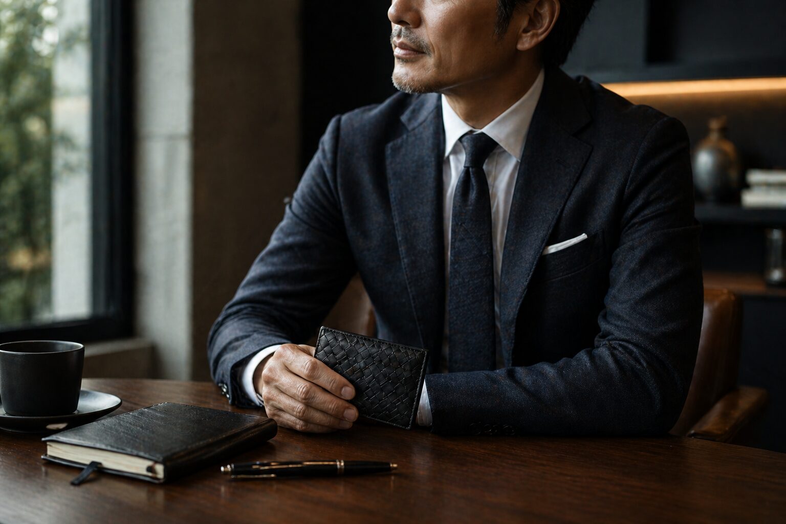 実際に通勤や商談で使う場面を考えると、名刺入れだけが浮くより、全体の持ち物になじむかが重要です。黒い革靴、シンプルな時計、落ち着いたビジネスバッグと合わせると、違和感は出にくいです。