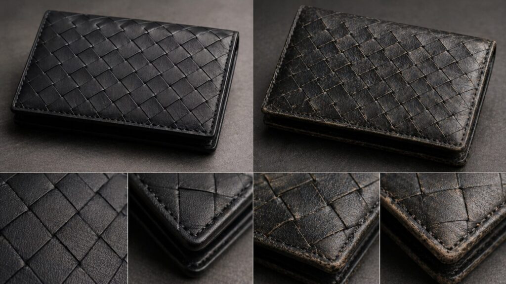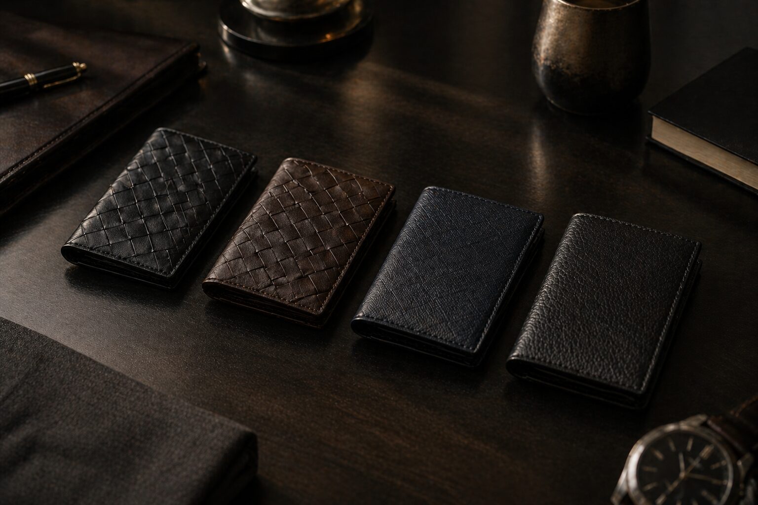 違いが出るのは、革の柔らかさ、編み込みの均一感、端の処理、開閉時の感触です。ボッテガ公式でも、メンズのカードケースはレザー製品として展開されています。