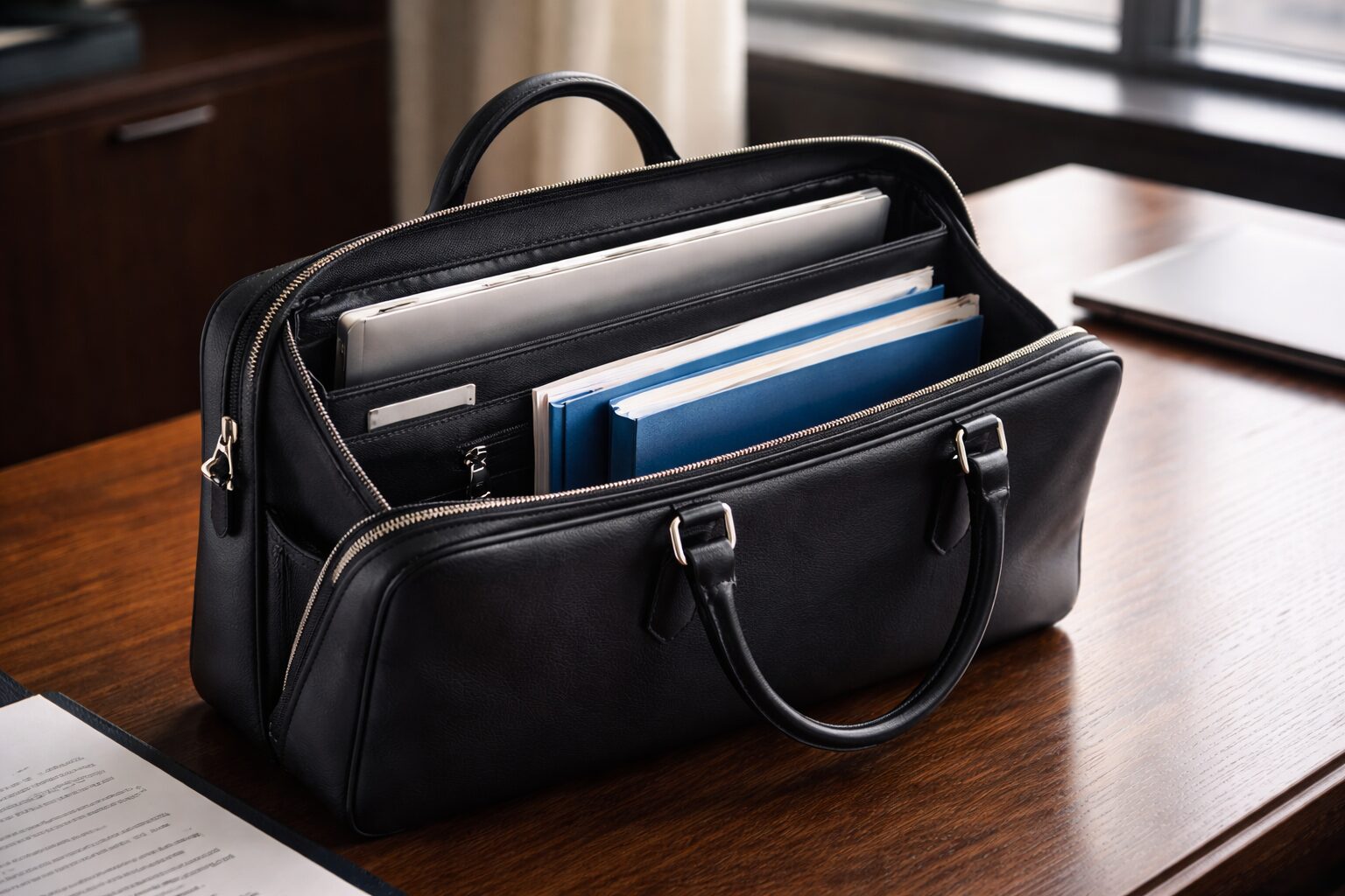 まず重要なのが「自立性」です。自立するバッグは床や椅子脇に置いたときに倒れにくく、商談や会議の場で所作が整って見えます。これは相手に無意識の安心感を与えるポイントです。