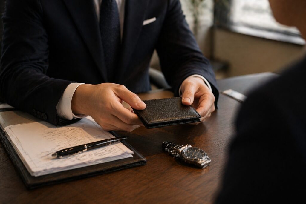 名刺入れ単体ではなく、腕時計、ベルト、靴、バッグとの温度感も重要です。