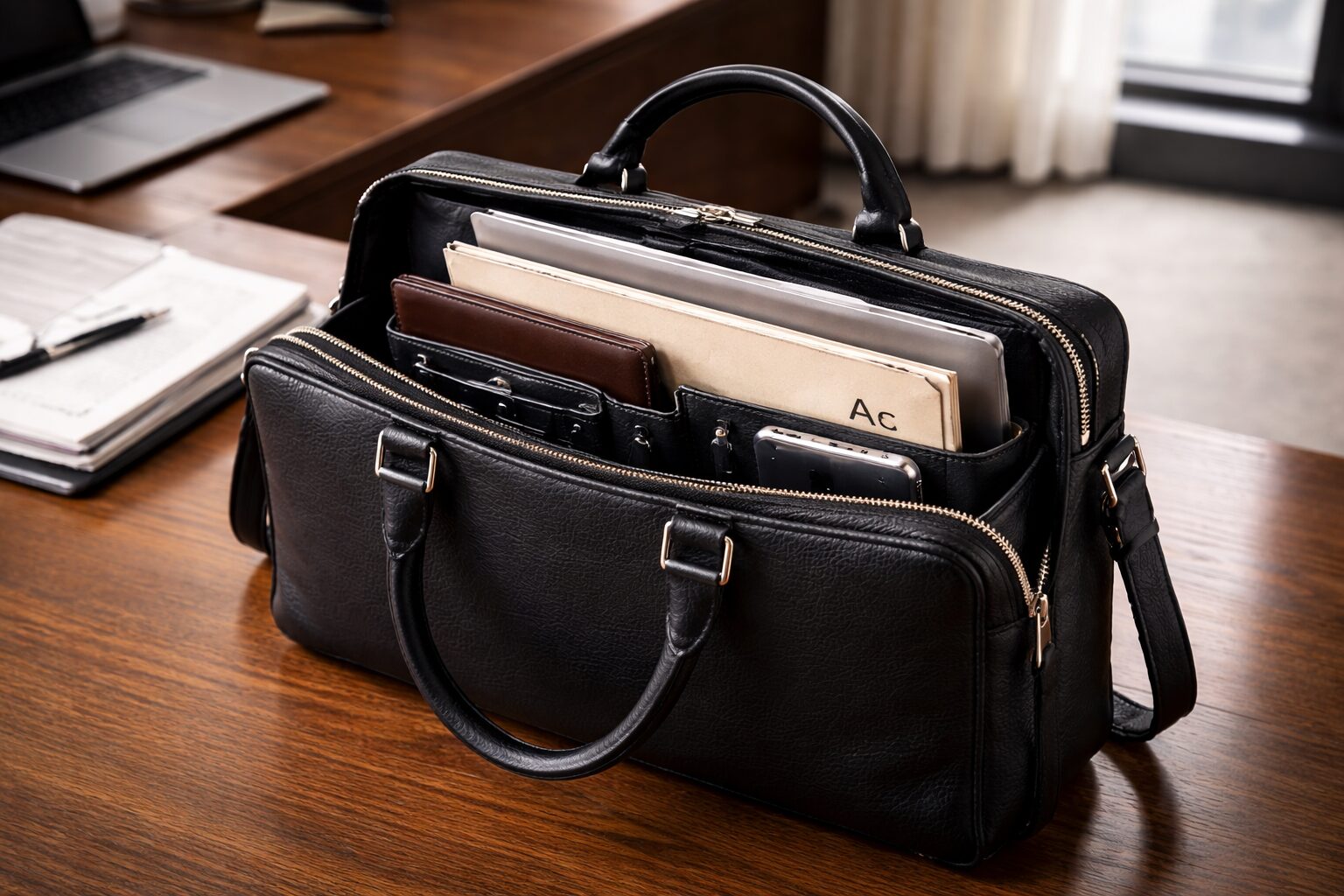 2A4×本革で安心:書類・PCが無理なく収まり、本革の質感で信頼感が出る