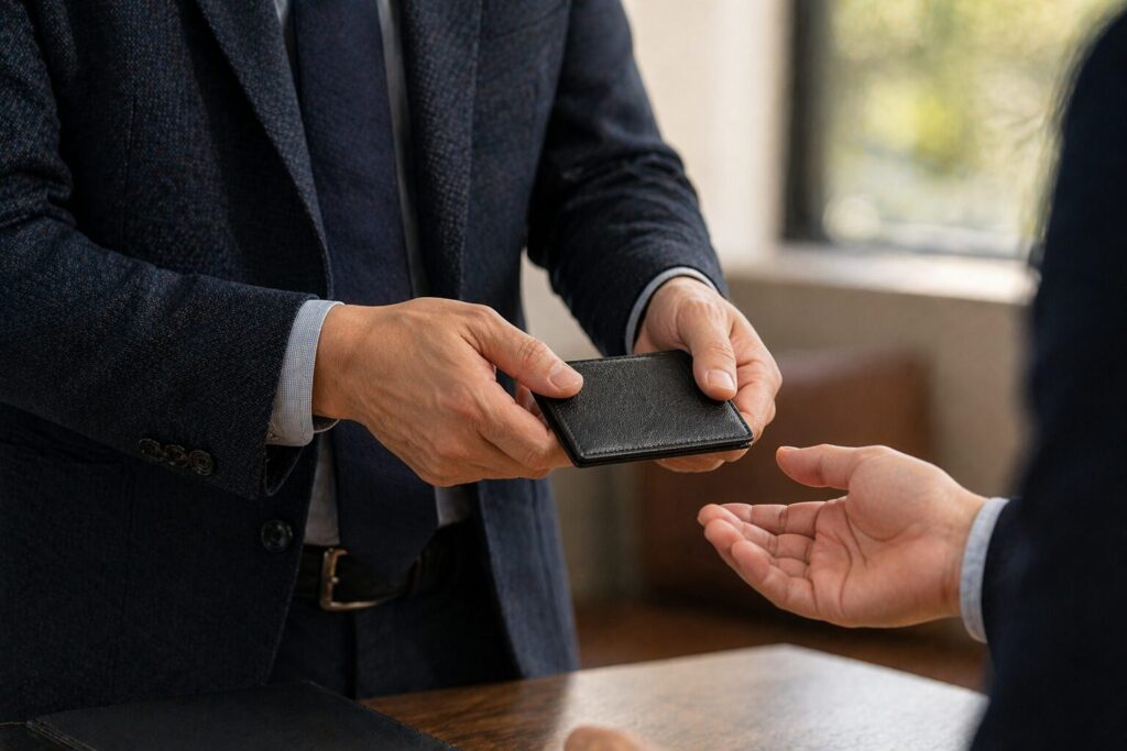 商談や初対面の場では、名刺入れそのものの豪華さより、全体として清潔感があるか、持ち物に違和感がないかが見られやすいです。私も会議や打ち合わせで感じますが、持ち物が主役になりすぎると、逆に気になることがあります。